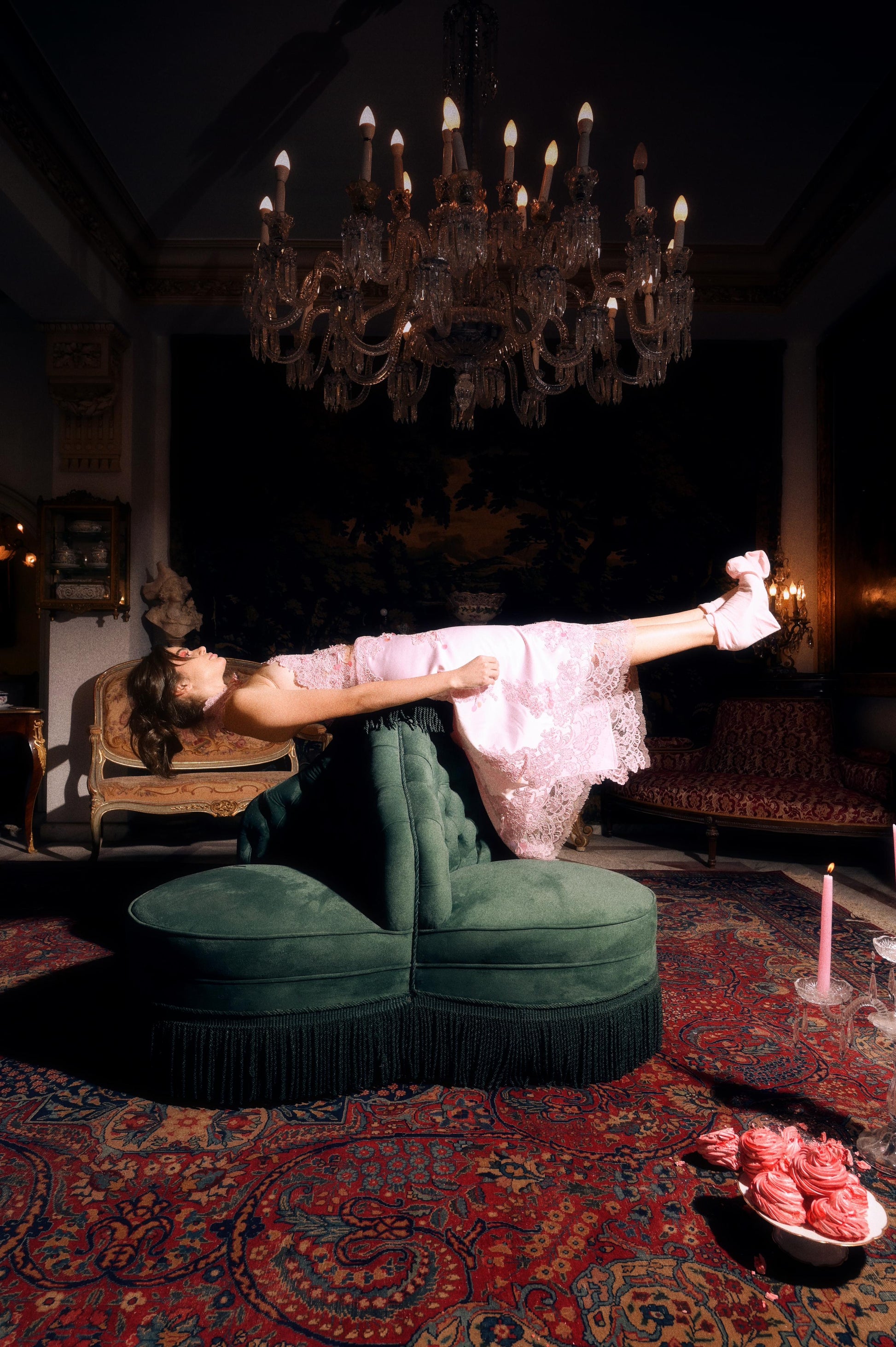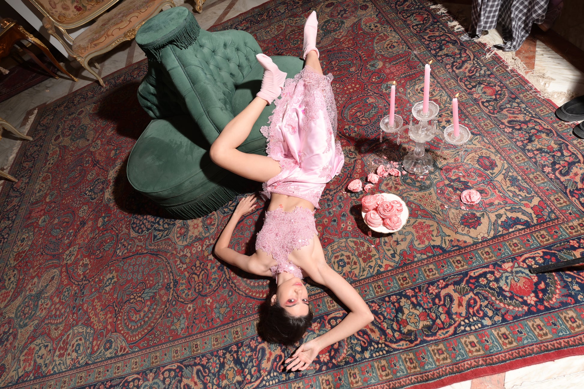 A breathtaking embodiment of elegance, this set features a handmade lace top adorned with pink embroidered petals that gently dangle, creating an exquisite fluidity. Paired with a silk skirt that carries the same delicate lace and embroidery details, this ensemble radiates timeless beauty and grace. The subtle shimmer of the silk, combined with the intricate craftsmanship, creates a harmonious blend of softness and sophistication. Perfect for an evening of refinement or a special occasion where every detail matters.