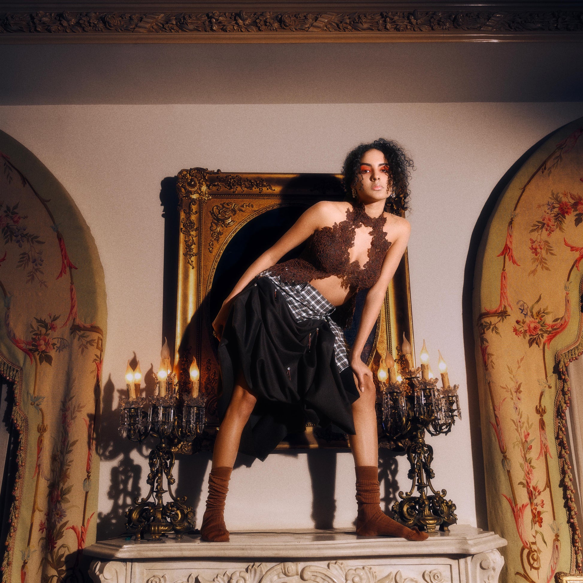 A stunning fusion of masculine and feminine elements, this set combines a brown lace top with an asymmetrical, hand-draped skirt. The skirt, featuring a men's waistband in plaid, is beautifully contrasted with soft, voluminous brown fabric, embroidered and adorned with silver stones and brown beads. Each stitch is carefully placed by hand, resulting in an impeccable drape that moves with grace and fluidity. The hand-embroidered details, coupled with the structured plaid, create a rich, textured narrative of strength and softness. A truly bold yet refined piece for those who embrace the beauty of craftsmanship and contrast.