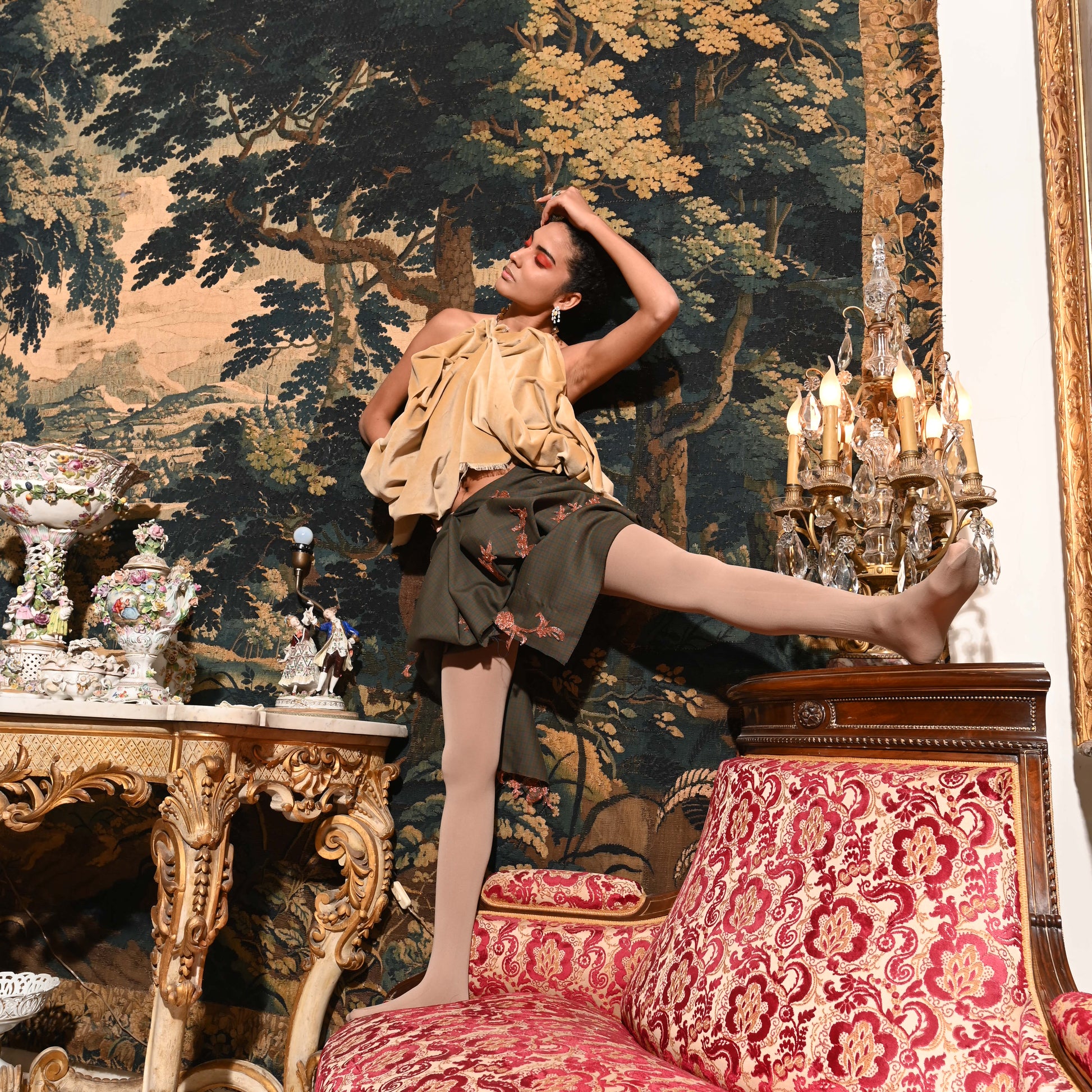A harmonious dance of elegance and contrast, La Danse des Ombres combines flowing lines and bold details. The green checkered skirt, draped and adorned with delicate orange lace, moves gracefully with every step, while the nude top drapes effortlessly to complement the skirt’s fluidity. The back, featuring gold and brown straps, adds a striking and sophisticated touch. This piece captures the perfect balance of softness and strength, creating a mesmerizing interplay of textures and colors that evokes a sense of mystery and refined